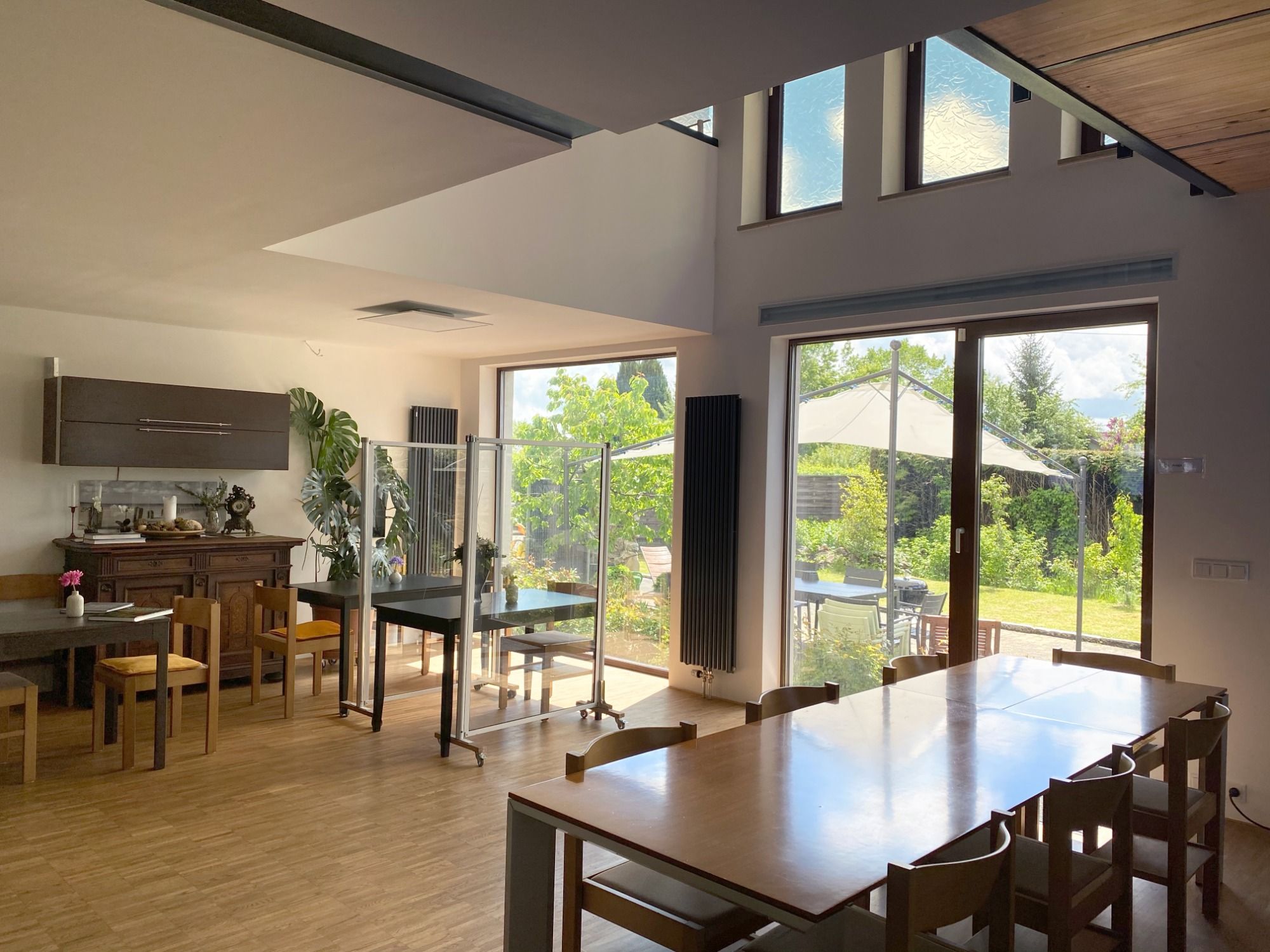 Die Räumlichkeiten der Tagespflege sind frisch renoviert, bieten jede Menge Komfort und sind vor allem Rollstuhlgerecht gestaltet. Das Herzstück der Einrichtung bildet dabei der Aufenthaltsbereich, der durch seine offene Raumgestaltung besticht. Große Fensterfronten zur Südseite mit Ausblick zum Garten sowie eine offene Galerie sorgen für ein offenes und lichtdurchflutetes Ambiente. Mit Tischgruppen entlang der Fensterfront wird das Tageslicht optimal genutzt – ob beim Essen, Spielen oder Unterhaltungen. Bequeme Sitzgruppen und ein wärmespendender Kamin bieten den perfekten Ort für eine Pause. Am Aufenthaltsbereich angeschlossen befindet sich die hochwertig ausgestattete Küche mit freistehender Kücheninsel, die im Rahmen des Therapie-Programms zum gemeinsamen Kochen oder zu kreativen Beschäftigungen, wie der Herstellung von Seifen oder Tees einlädt. Weitere Rückzugs- und Therapieräume sowie die sanitären Anlagen inkl. einem behindertengerechten Dusch-WC, befinden sich ebenfalls im Erdgeschoss.